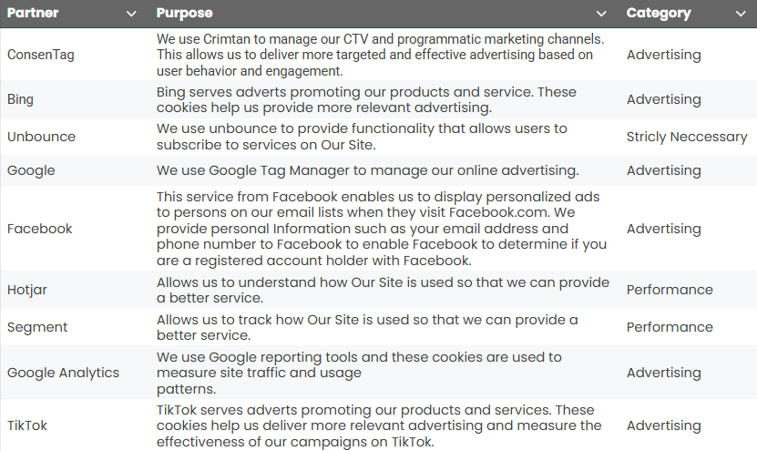 Here is a breakdown of cookies we use, what they are used for:
