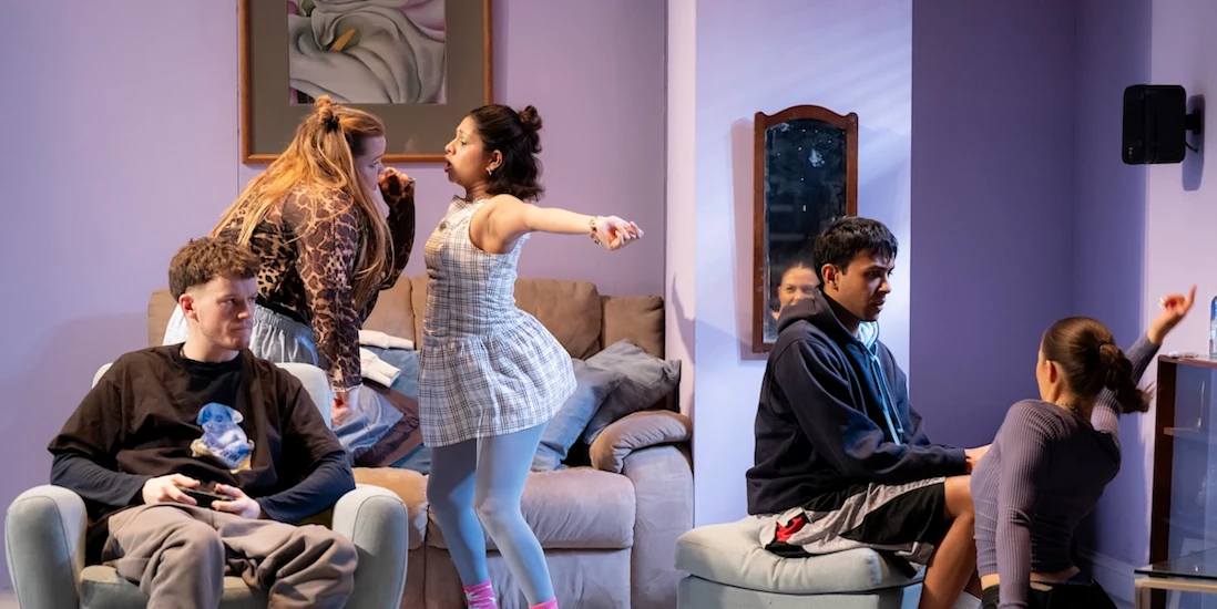 The girls aren’t the only ones prepping to party though. As they practise strengthening their gag reflexes with toothbrushes in the bathroom, next door Chloe’s older brother Joel (Ragevan Vasan) and his mate Mel (Alec Boaden) are also considering a night out. Even if the boys’ preparation is far more chilled, and really only involves playing video games and avoiding talking about their feelings, Jaz Woodcock-Stewart’s production masterfully captures the agonising awkwardness many young men feel too, with Vasan crumpling to the floor in despair over his bottled-up feelings for Jess.