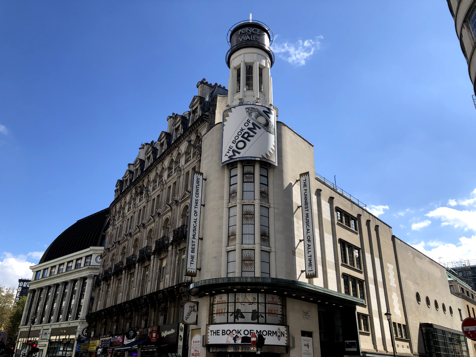The Book of Mormon is at the Prince of Wales Theatre in London. The Prince of Wales Theatre is located close to Leicester Square. It's near West End theatres including the Criterion Theatre and Theatre Royal Haymarket.